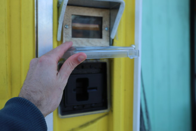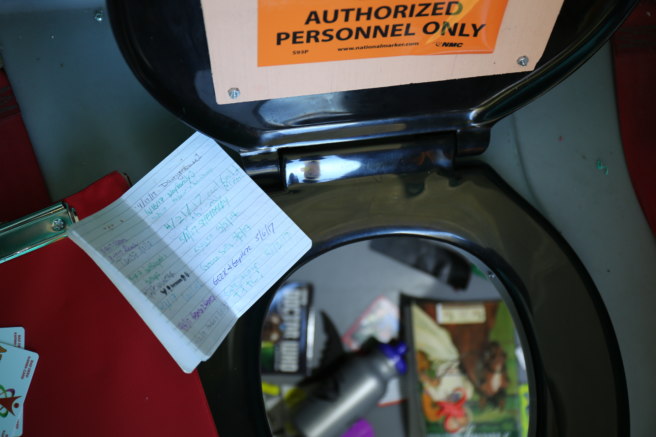 It starts with step number one, entering the cache. You need to bring a card with a magnetic strip to unlock the door then push the yellow knob to open it. Once inside there are a few things you may notice such as a special flusher, seat belt, TV, keypad, and panic button—it’s pretty high tech in there.