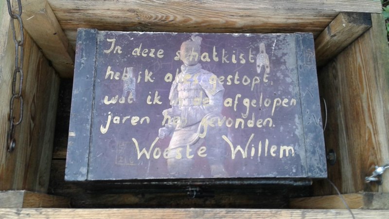The cache is located in the Netherlands on the outskirts of a small hamlet called Vatrop. Placed with permission of the property owner, it resides in a large wooden box attached to the property. Opening the box reveals a secret treasure chest Willem hid here after his retirement. It is a true pirate treasure, filled with doubloons and other valuable trinkets.