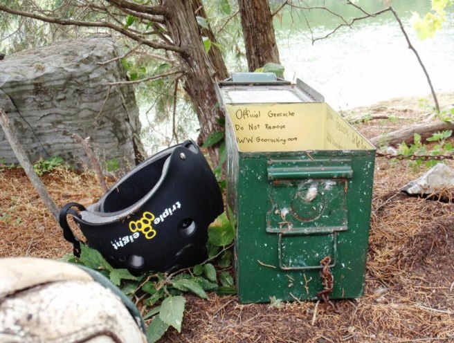 After you paddle to the pillar, anchor your top ropes, and slip into your harnesses it’s time to ascend to the top. The treasure you seek on ‘Treasure Island’ is a large ammo can safely anchored at the top of the pillar. Cache logs warn, however, the climb up isn’t as easy as the climb down. Satisfaction settles in pretty quickly once the kayaks are pulled to shore, equipment is put away, and the view of the pillar is from safe and stable ground.