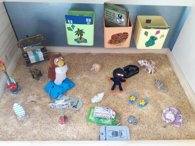 The cache owner, Die schwarze Wittwe, clearly put their heart and soul into this container. The dioramas are filled with miniatures to create a bath scene and beachscape in the penthouse of the hotel. Containers are included for effortless organization of any trackables and SWAG that wish to extend their stay.