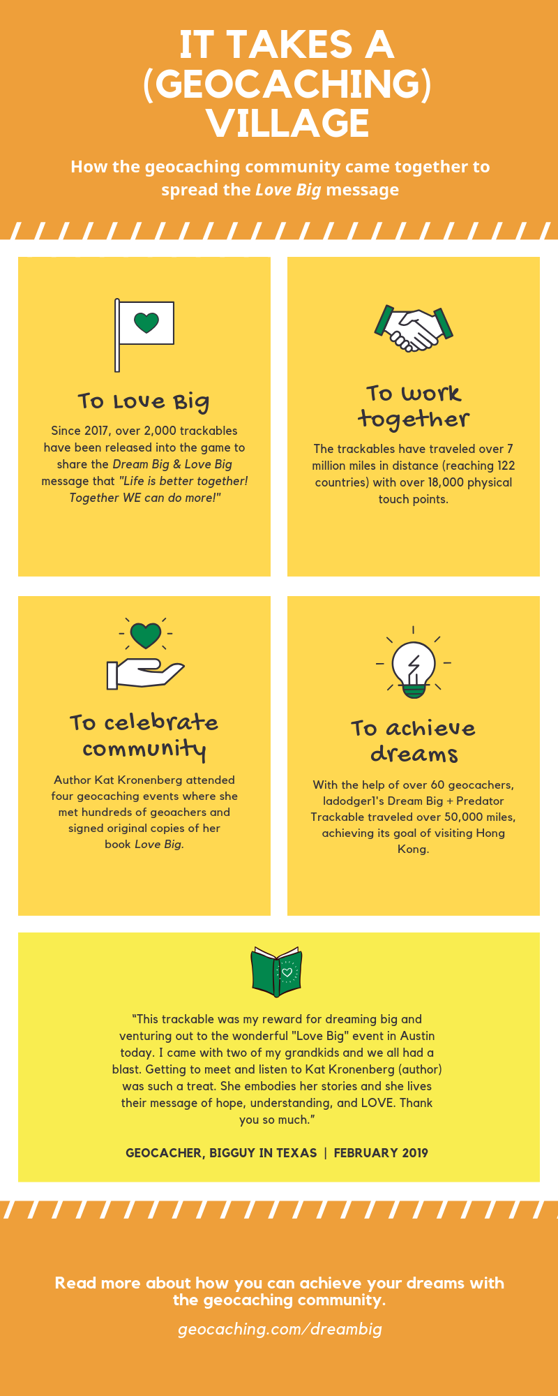 February through May 2019, geocachers worked together to move bestselling author Kat Kronenberg’s Love Big trackables towards their goals. Although the official promotion and the #GeocachersLoveBig photo contest ended, you can still share in the fun when you find a Love Big trackable in a geocache.