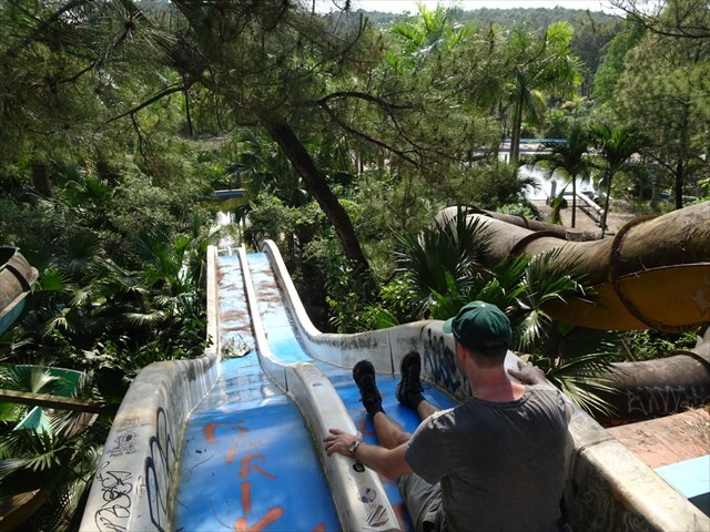 Cachers coming to find GC6GDTH should add extra time to their outing to ensure they can explore all parts of the park. A walk through the grounds takes visitors to an overgrown amphitheater, abandoned waterslides surrounded by lush palm trees, and graffiti-covered villas.