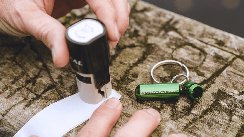 Use a custom stamp. A custom stamp is another great way to avoid the spread of germs. Many dedicated geocachers make or order custom stamps with their usernames.