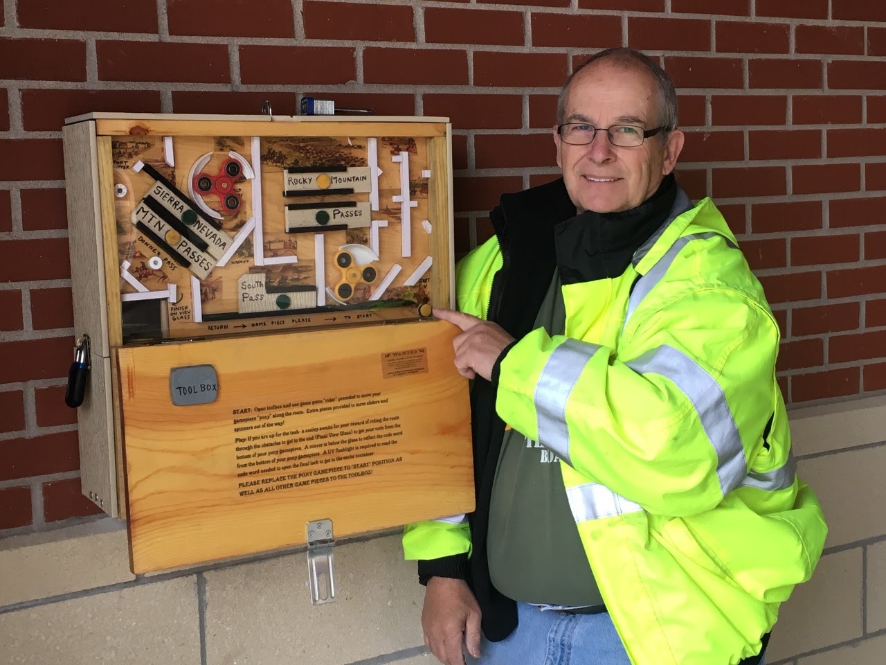 Mo pirate: I like caches for different reasons so I like my Pony Express Trail Challenge as it gives you a tour of the 1066 mile trail from St Joseph, MO to Sacramento, CA. Just imagining the travel of this trek without any fast food stops or even a GPS would have been something back in 1860. However, if you can not make the journey, I created a maze in a box to replicate the Pony Express Route (GC7JWV9) and placed it across the street from our huge Pony Express Statue in downtown St Joseph. You need to open it to move the magnetic gamepiece from the start in St Joseph, MO through the mountain passes and obstacles all the way to Sacramento, CA where you use a UV light to read the bottom of your gamepiece for the final combo code. I made it so all of my sliders open and then close so it resets itself for the next user. It is a “must do” as it is my most elaborate build so far. It is also a nice teaching tool for the kiddos to learn about this part of history while being in the city where it all started!