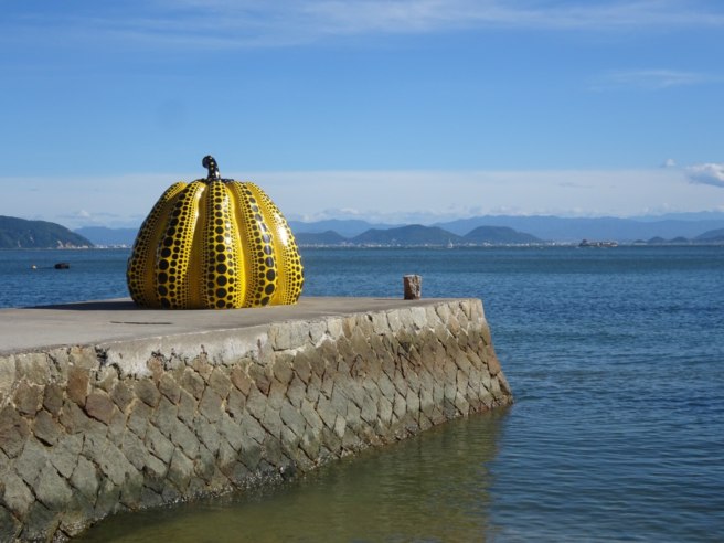 The island of Naoshima in Japan is filled with contemporary art, sculpture, and installations. One of these sculptures has gained much fame. Installed in 1994 and sitting at the end of a pier is a giant yellow pumpkin with black dots designed by famed artist Yayoi Kusama.