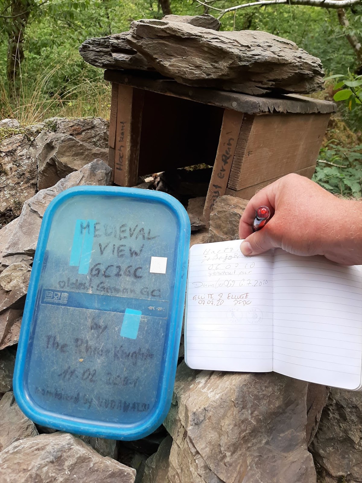 There is a main path that leads to the castle, and a smaller path to the northwest that leads towards a wooded area. If you take that lesser traveled path, you have found one way to begin your trek to this memorable destination. Walk through an enchanting forest and use your geo-senses to find the blue-lidded cache that holds twenty years of geocaching memories. Tucked away on a scramble of rocks the CO made a wooden box camouflaged with a rock on top of it.