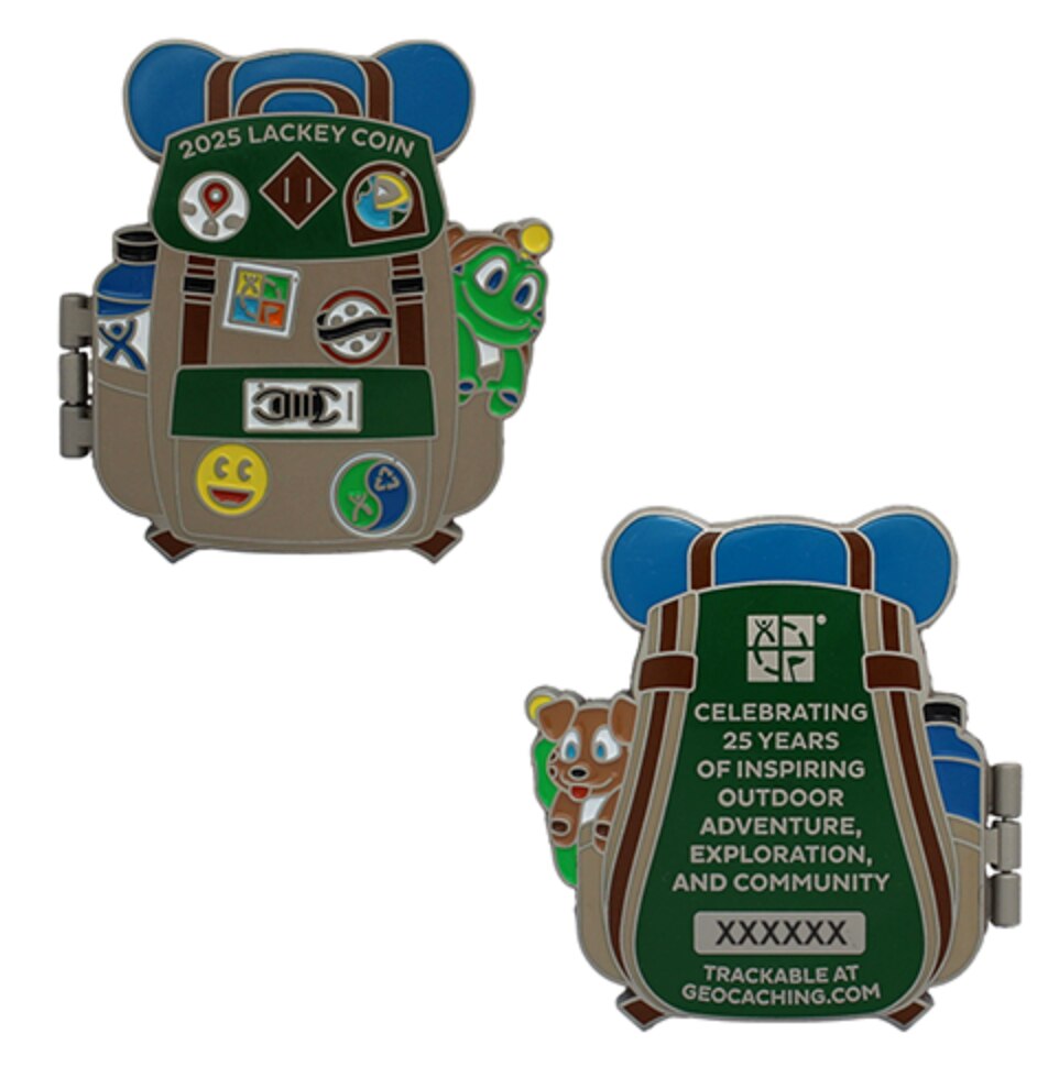 The 2025 Lackey coin is inspired by a sense of adventure! This backpack design opens up to reveal the pixel icons of the Geocaching HQ Lackeys who share the honor of serving the global geocaching community every day. A trackable tag is also included with a second unique tracking code. The coin was available in a matte nickel finish from Shop Geocaching, and in a copper finish exclusively at the HQ Visitor Center. In late October 2025, an unprecedented third finish (antique bronze) was released after the matte nickel sold out. As with all Lackey coins since 2011, this is designed by Roxxy.