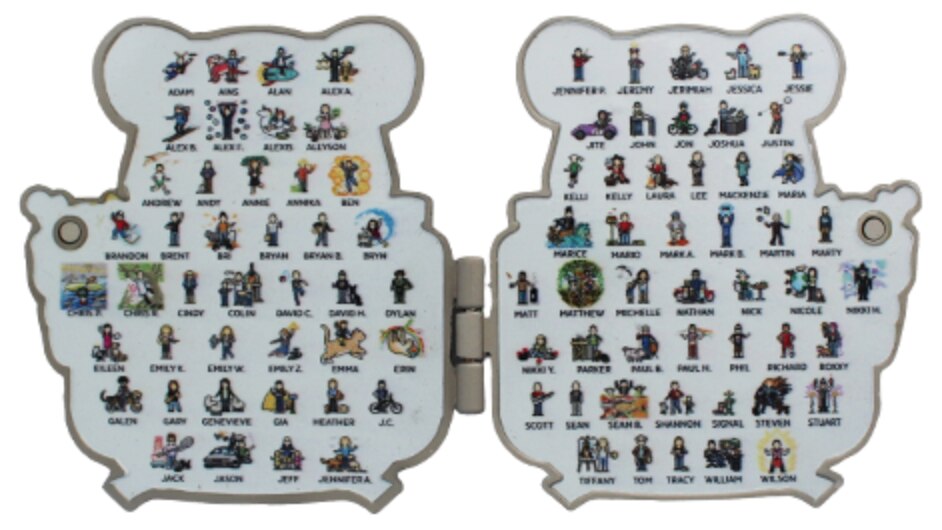 The 2022 Lackey coin is a recreation of a curio cabinet. Open the cabinet doors to see the pixel icons of the 91 Lackeys and Signal. Designed by HQ’s Roxxy, the coin includes a trackable tag, and was available in a satin silver finish from Shop Geocaching, and in an antique gold finish at the HQ Visitor Center.