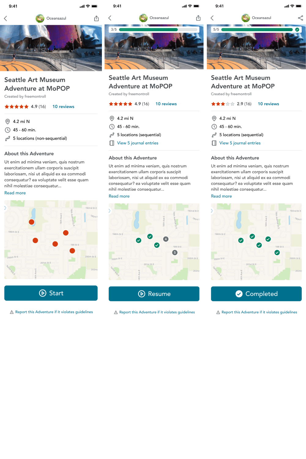 We gave the Adventure Lab® app details screens a makeover, just in time for the holidays. We improved usability and added new handy information such as time to complete, a progress bar, and numbered stage pins for sequential Adventures. See what’s new in our side-by-side comparison below.