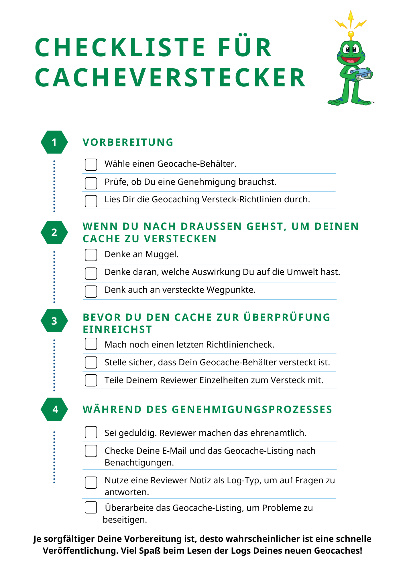 Lass uns ein paar Dinge vor, während und nach dem Verstecken Deines Caches checken. Am Ende dieses Blogs haben wir eine Grafik eingebaut, die Du abspeichern und ausdrucken kannst, damit Du eine Checkliste in Händen halten kannst, um Dich für einen Erfolg beim Verstecken gut vorzubereiten.