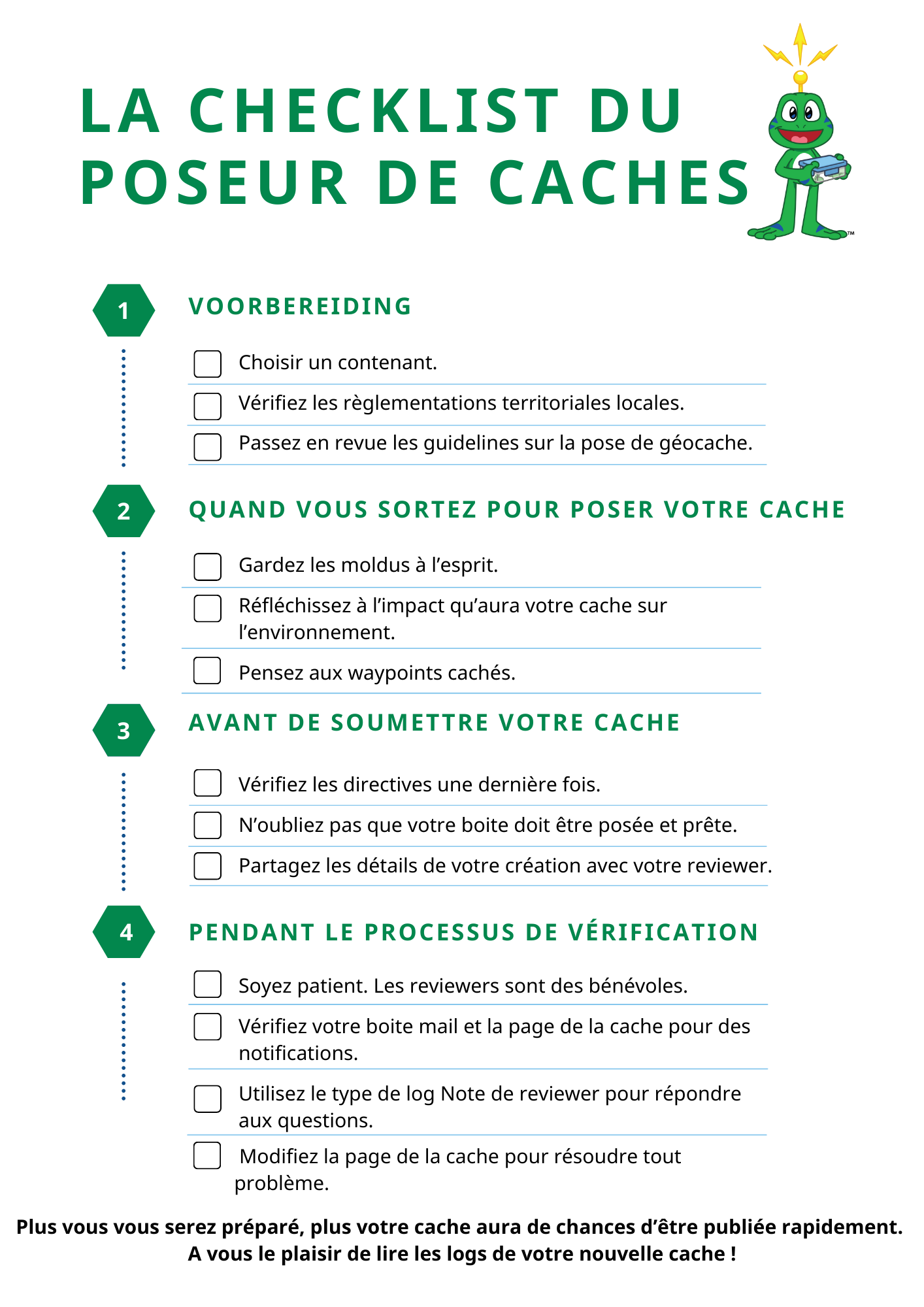 Passons en revue quelques éléments à vérifier avant, pendant et après la pose de votre cache. À la fin de l’article du blog, nous avons inclus un graphique que vous pouvez sauvegarder et imprimer afin de disposer d’une checklist physique qui vous permettra de créer une cache avec succès.