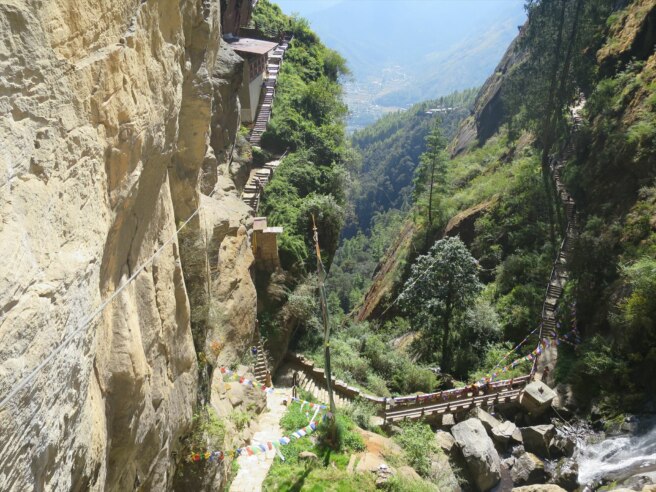 To begin your journey to this elevated treasure, travel 30 minutes by car from Paro, a historic valley settlement, to the Taktsang Trailhead. Breathe in, ground yourself, and look skyward. Although you’re already at 8,000 ft (2,400 m) above sea level, the trip to the monastery tests your lung capacity with an additional climb to 10,200 feet (3,120 m) over approximately 2 miles (3.2 km). If you’re unable to make the trek on foot, a trip on horseback is available for an additional fee.
