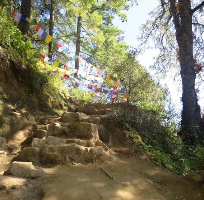 The steep terrain undoubtedly claws at your stamina. Thankfully, colorful Tibetan prayer flags guide the path toward the monastery and the cache. Hung in high places, the flags carry prayers and mantras, which many believe are blown by the wind into the space around. Regardless of your spiritual background, the flags remind you of the many travelers who have walked this path before.