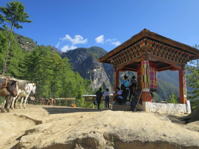 If you elect to hike, take a moment to feel the earth beneath your feet with each step. With each passing moment, it’s a challenge not to respect the magnificence of the mountain. Thankfully, the climb has moments to rest, reflect, and admire the picturesque surroundings. A third of the way to the monastery is a plateau with numerous ornate prayer wheels and a small cafe that offers a nice break.