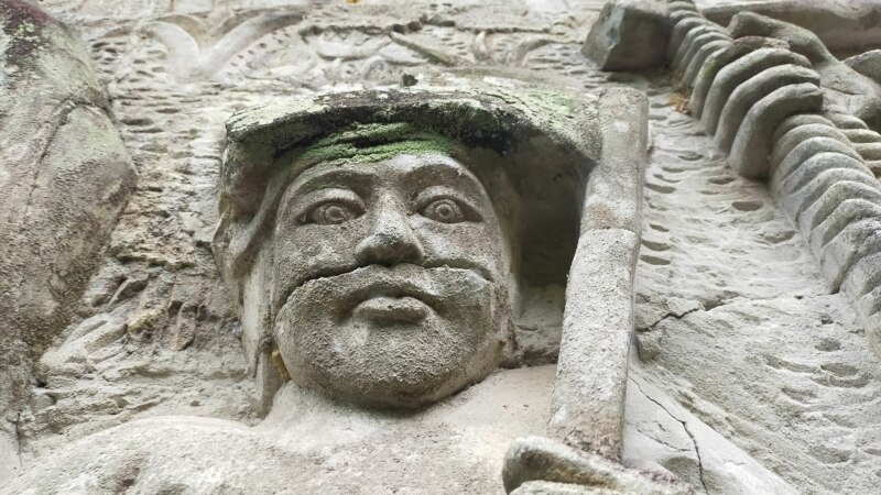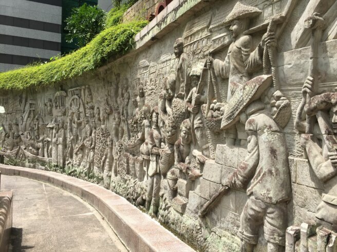 A large mural greets you at the High Street entrance to the park. The mural depicts activities of the Malay culture of ancient Singapore, beginning in the 14th century. Approach the carved mural to start the ultimate game of “I Spy.” Take your time; there is a lot of history to examine. You are looking for a micro cache hidden in the mural in plain sight. Do not use brute force for this hunt, just a gentle hand and an observant eye.