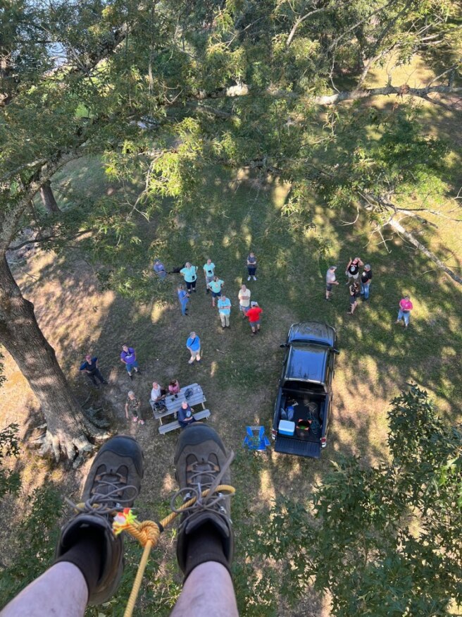 You arrive at GZ full of excitement and anticipation to finally find this cache. You may discover that you’re not the only one there to find the cache; other enthusiastic cachers wait with you to get their hands on the cache at the top of the tree. Those who wait for their turn cheer each other on as each person makes their way up. Finally, it’s your turn to get all geared up for the climb.