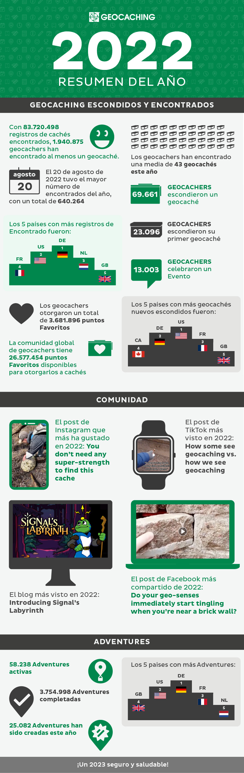 Otro año de geocaching ha finalizado y ¿cómo ha sido? 2022 estuvo lleno de nuevos cachés y Aventuras, registros de “Encontrado” y excitantes Eventos incluyendo nuestra Celebración del 20 Aniversario. Al comenzar el nuevo año, queremos compartir una mirada hacia todo lo que ocurrió en el geocaching en 2022. Aquí mostramos 18 estadísticas que destacan los logros de la comunidad de geocaching durante año pasado: