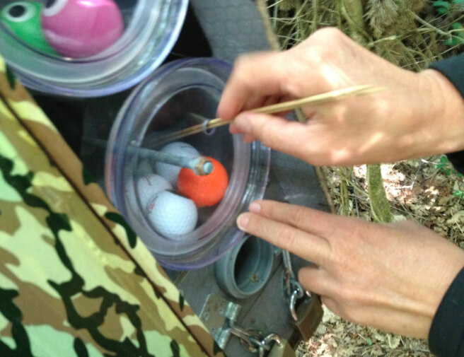 Open the front of the birdhouse and the above image will be presented to all geocachers who attempt to sign the logbook. Four cylindrical plastic compartments with a small hole on the front are filled with miscellaneous items, such as golf balls and film containers, and sit ready for action. On the inside of the door is a small handful of wooden skewers; with these, the logbook will be easier to find.