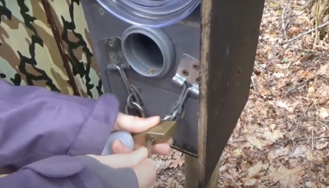 With a lot of hard work and determination, both film canisters make their way to the bottom, and now it’s time to unlock the padlocks. Once both are unlocked, the locks are removed, the bottom flap falls open, and the glorious cache container is in sight.