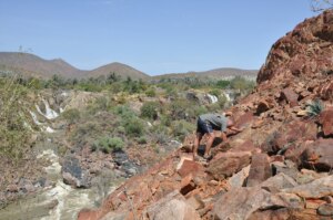 This week we’re on the hunt for “Riana’s Treasure,” a Traditional Cache located somewhere along the rocky ledges of Epupa Falls. Epupa Falls is a part of the Kunene River, which flows along the border of Angola and Namibia in the Kaokoland area of the Kunene Region. Epupa Falls is Namibia’s grandest waterfall, which flows down a 131 ft (40 m) deep gorge. In fact, Epupa means “falling water” in the Herero language.