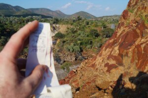 This week we’re on the hunt for “Riana’s Treasure,” a Traditional Cache located somewhere along the rocky ledges of Epupa Falls. Epupa Falls is a part of the Kunene River, which flows along the border of Angola and Namibia in the Kaokoland area of the Kunene Region. Epupa Falls is Namibia’s grandest waterfall, which flows down a 131 ft (40 m) deep gorge. In fact, Epupa means “falling water” in the Herero language.