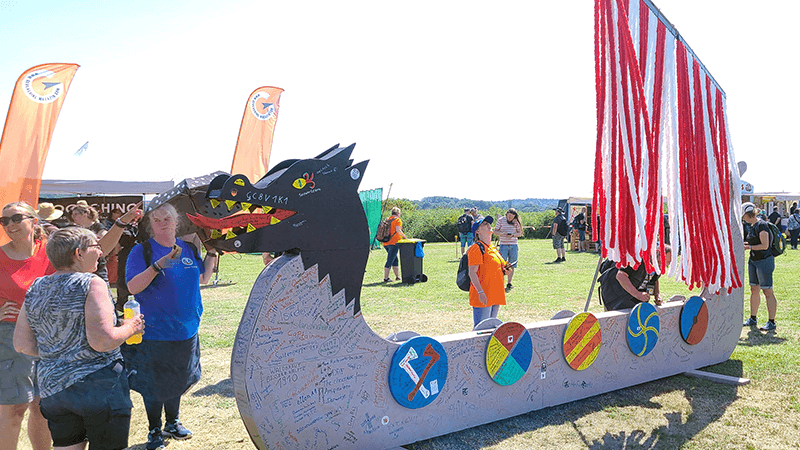 Osvěžené adrenalinem z lezení jsme se vmísily do eventu a setkaly se s geokačery z mnoha různých zemí a užily si nějaký čas v reviewerském stanu (skvělé místo pro setkání s dobrovolnými reviewery a dalšími geokačery). Mezi nejzajímavější aktivity patřil logbook ve tvaru vikingské lodi s východoněmeckým dětským hrdinou Pittiplatschem na vrcholu stěžně; vikingská limonáda, kterou jste mohli pít z tradiční vikingské nádoby na pití (rohu); různorodé labky, od hlavolamových v Braillově písmu, bluetooth na stromě až po návštěvu “u Vikingů”, kde jsme se od vikinga dozvěděli, co je potřeba k výrobě pravé vikingské lodi.