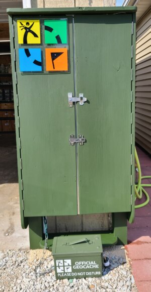 As you approach GZ, you see a green, wooden chest standing about five feet tall in the distance. An acrylic Geocaching® logo is attached to the front of the chest, and an ammo can sits on the ground beneath. With the cache container out in the open, you think you’ve come across your easiest geocache find yet. But wait—the adventure with this geocache has just begun!