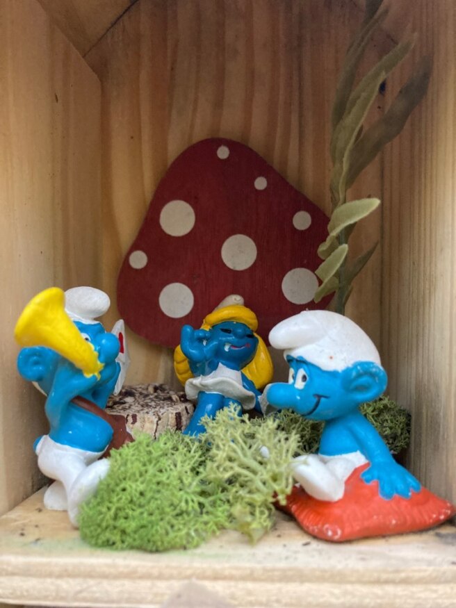 These little blue Smurfs are hiding around every corner, but where? High in the trees, tucked around tree trunks, or nestled in the leaves, they can be anywhere! With each Smurf, there is a petling container and a logbook inside. Behind the first few trees, the first Smurf is spotted! Smurfaroo! Only six more to go!