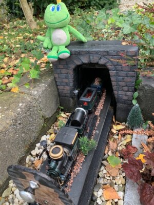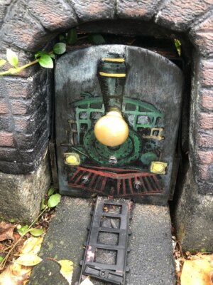 A miniature train tunnel sits on the garden’s edge, with a track extending in front of it. This has to be it! Rather than a model train, however, you see a door blocking the edge of the tunnel, complete with a painted engine and a small knob. Curiosity gets the better of you, and you pull it out to reveal…