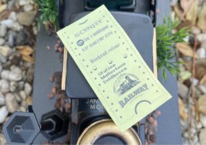 It turns out that you’re in luck, because this cache owner thought of everything! Behind the car containing the logbook, you find a handful of souvenir tickets made just for this purpose.