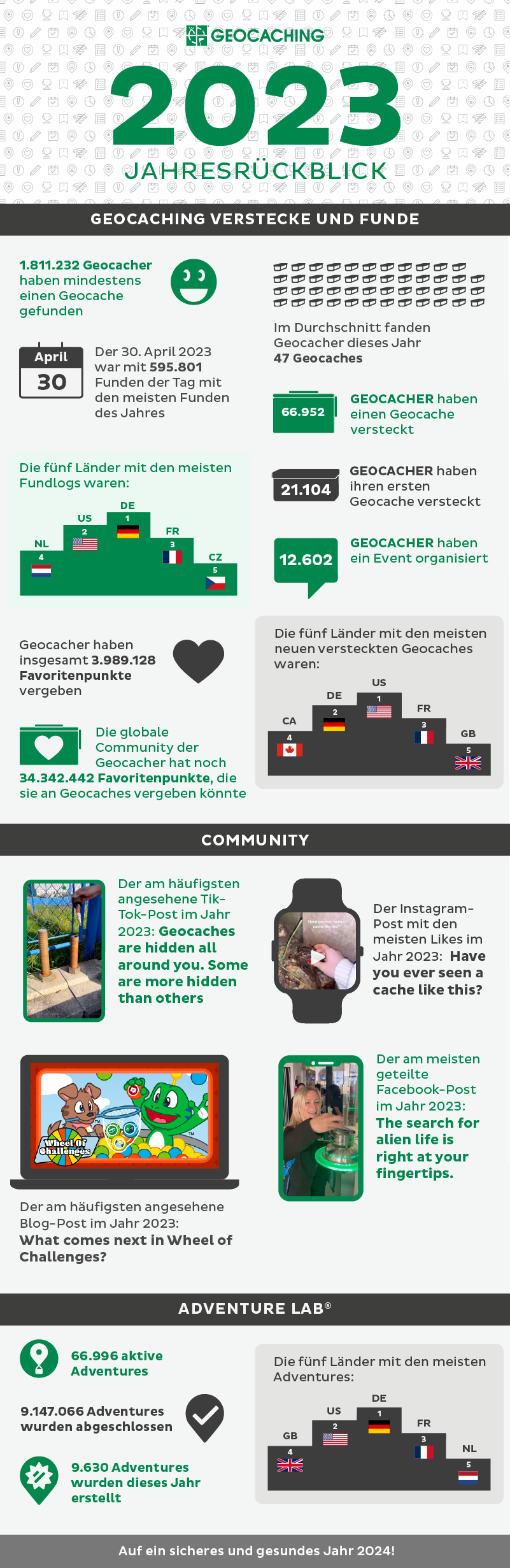 2023 ist jetzt vorbei und wir nehmen uns einen Moment Zeit, um auf ein Jahr voller Funde und Erlebnisse zurückzublicken. Wir besuchten Maker Magic Events, schlossen bei Event-Caches neue Freundschaften, drehten am Wheel of Challenges und entdeckten unsere Umgebung so, wie wir es am liebsten tun: mit Geocaching! Unten findest Du einige Statistiken, die zusammenstellen, was die Community im Jahr 2023 erreicht hat.