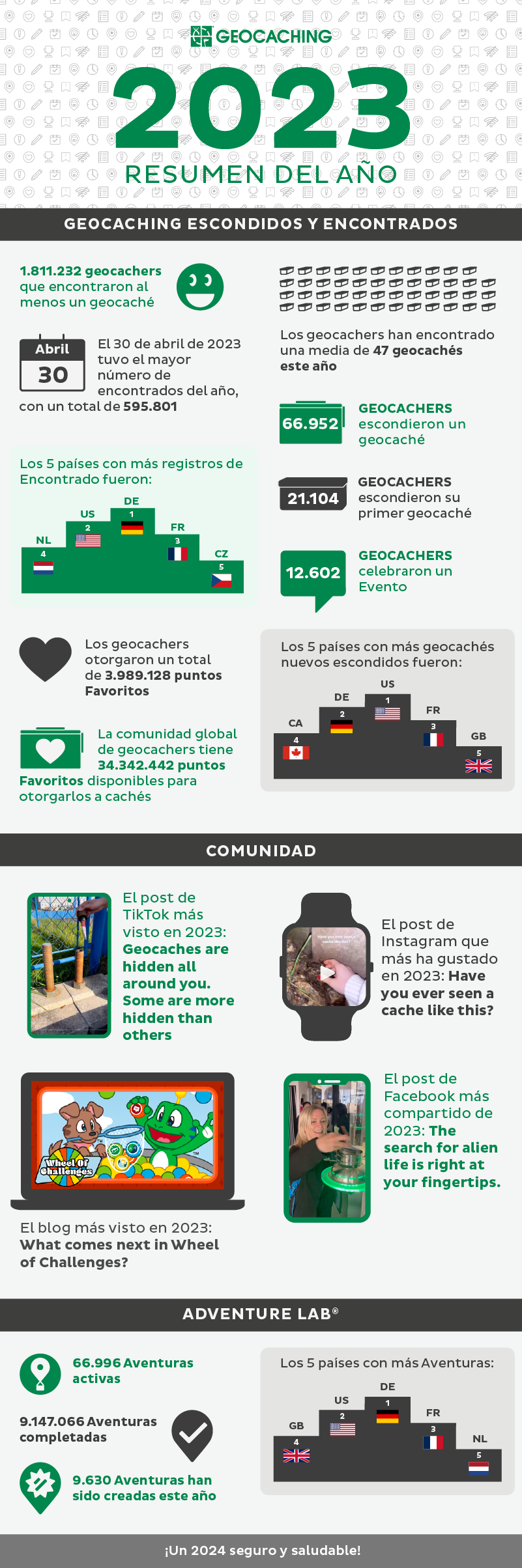 Una nota de Geocaching HQ: anteriormente compartimos números incorrectos sobre Adventures completados en 2023. El total correcto es 4.835.932.