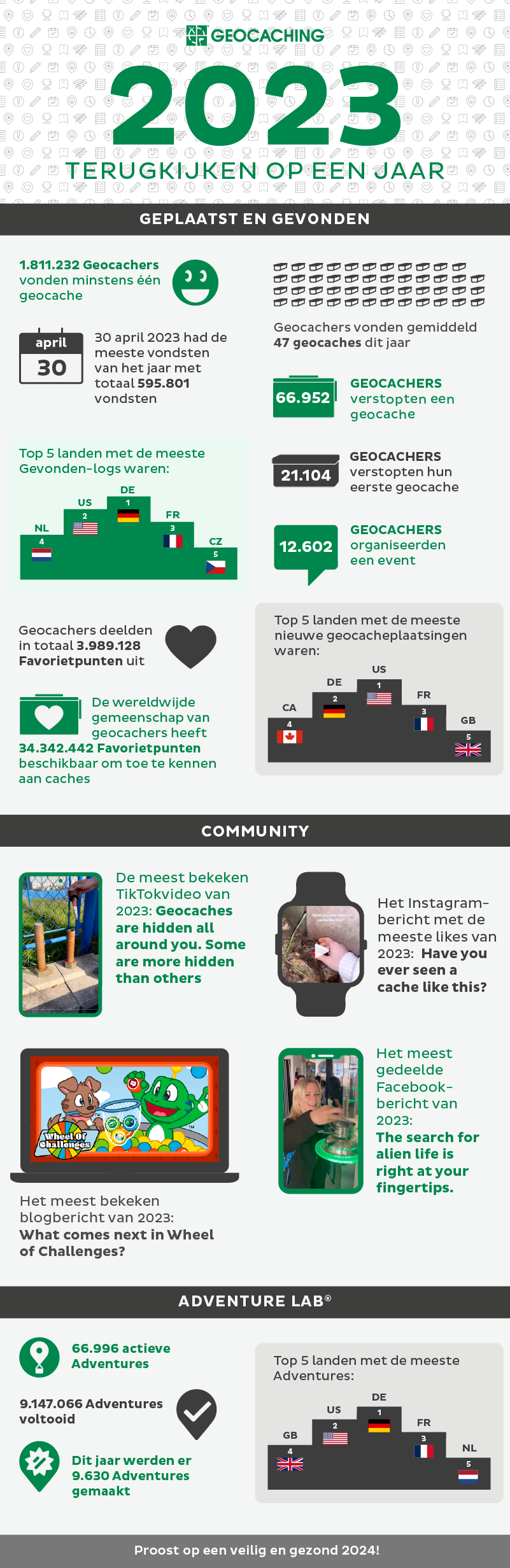 Een opmerking van Geocaching HQ: we hebben eerder onjuiste cijfers gedeeld voor Adventure-voltooiingen in 2023. Het juiste totaal is 4.835.932.