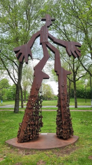 Nestled in a quiet little park in the charming city of Huizen is one of 60 geocaches in the Garden of Amsterdam GeoTour (GT5B). Upon entering the park and arriving at GZ, a larger-than-life statue casts a shadow on each new visitor. This is not just any statue; upon further inspection, it’s a person walking with thousands of keys on rings chained to the stilts underneath their feet.