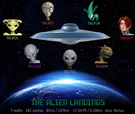 This is a Bonus Mystery Cache with exciting twists and turns. To begin the journey, searchers must find the required geocaches before seeking this Bonus cache. Visit the cache page and read about the incredible journey of one special spacecraft with seven unique alien species traveling through the galaxy.