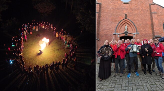 Llegamos justo a tiempo para unirnos a un pequeño grupo en una Adventure detrás de la pequeña y coqueta iglesia del parque. El ambiente jovial se apaciguó rápidamente al contemplar el inquietante camino iluminado por velas que teníamos ante nosotros. A medida que se atenuaba el ruido de la multitud, empezamos a oír a lo lejos una tenue e inquietante música de acordeón. Nos condujeron a un viaje hermoso e inquietante, buscando respuestas de brujas, dentro de cuevas y en las llamas de un artista del fuego. Al final, pusimos la guinda a nuestra exitosa misión firmando un libro de registro muy especial. A continuación, nos dirigimos al interior de la iglesia, donde corría la cerveza y se habían retirado las sillas para dejar sitio a una pista de baile, con un grupo que interpretaba canciones sobre geocaching.