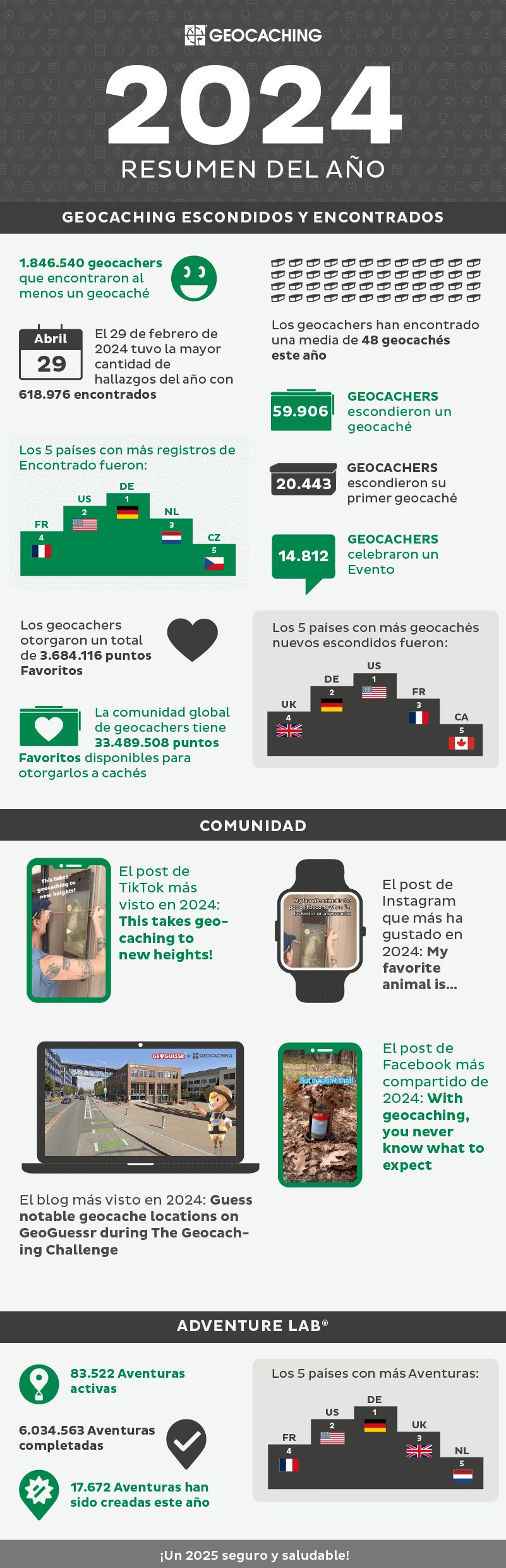 Hemos recopilado algunas estadísticas que muestran los logros de la comunidad de geocaching en 2024. ¡Miremos hacia atrás y celebremos juntos los aspectos más destacados de este extraordinario año!