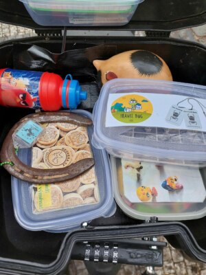 Inside of the cache are lettered lights that say “Moto-Cache-Praha”—a nice treat if you’re night caching. Aside from the bright lights, you can sift through the SWAG and trackables to see if there’s anything of interest. A large geocache in a metropolitan area is a rare thing, and takes some clever attention to detail to pull it off while hidden-in-plain-sight.