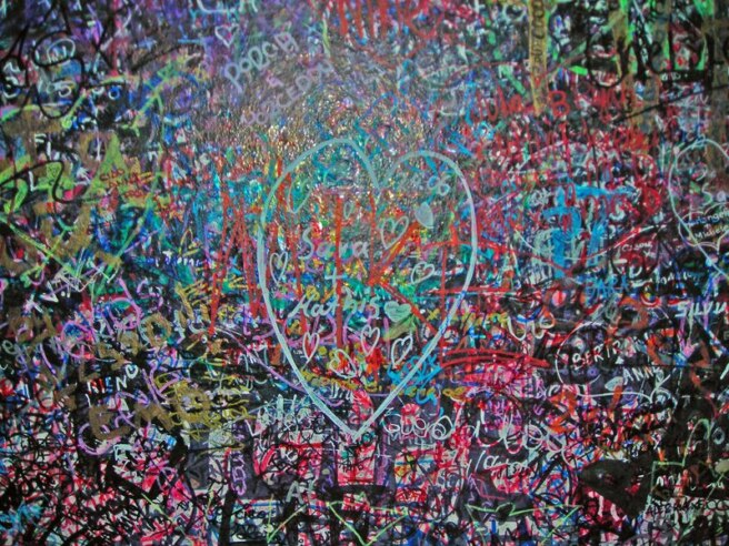 Geocachers arrive near GZ’s courtyard and proceed through a Gothic-era entrance portico. The walls host thousands of graffiti hearts, dates, and dedications from lovers.
