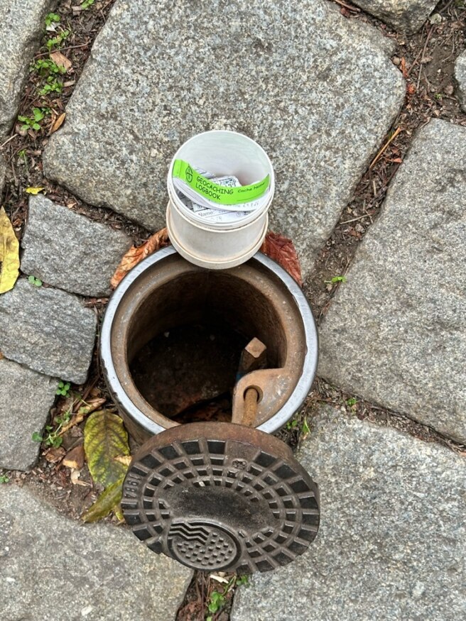 Once the correct streetlight is located, it’s time to search. Does the first hint make sense now? Hidden cleverly in plain sight is the 20-year-old small geocache. It’s time to ink the logbook with the next username and add to the history of the cache and the neighborhood.