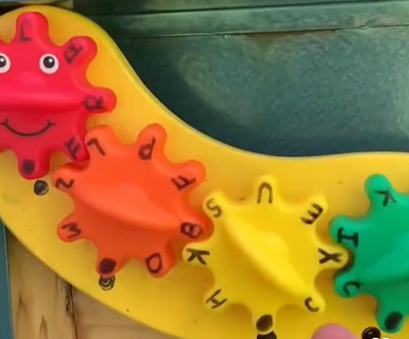 The first step is to match the five color-matching cogwheels provided in the cache to the five colored pegs already secured in place. Each tooth of the cogwheel has a letter on it and one black dot. It’s important to align the black dots on each cogwheel with the dot on the peg to secure the starting alignment.