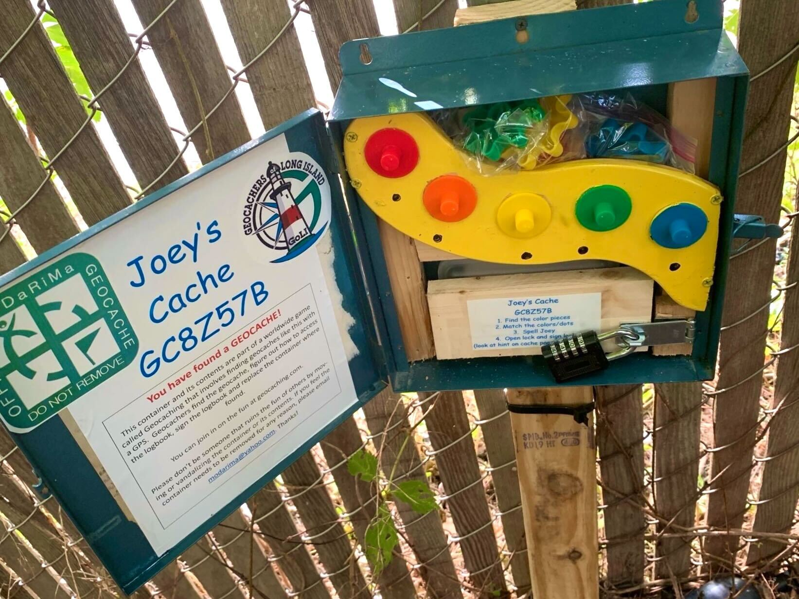 Next, geocachers must turn the wheels to spell out the name Joey. Each letter is associated with a corresponding number. Once Joey is spelled out, four numbers should be obtained, which geocachers then must enter into a combination lock holding the log sheet.