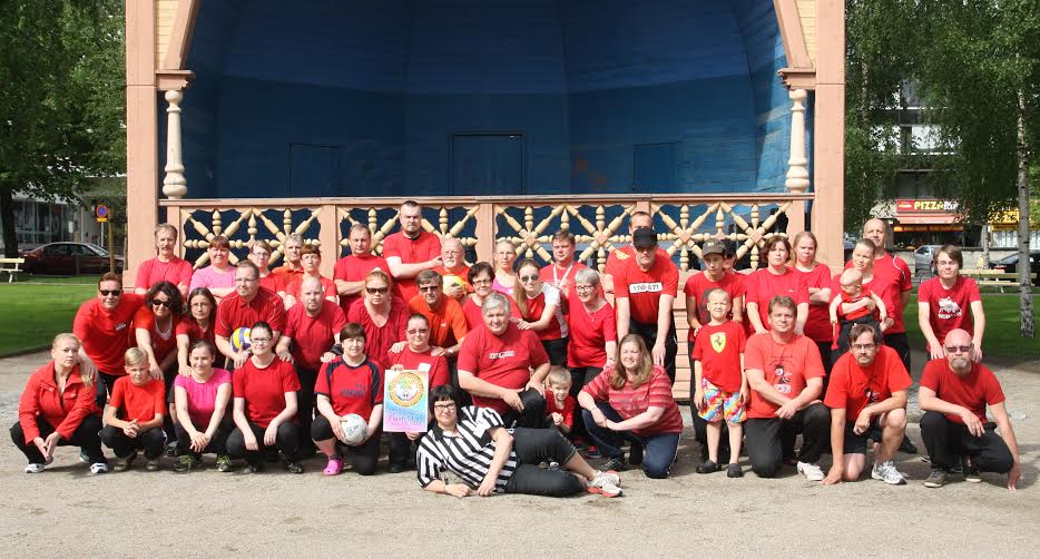 During the event the geocachers gathered to the main park of our town to take a football club type of photo – with everyone wearing a red shirt and black pants. All participants were asked to gather to the different parts of the park. When the referee whistled, everyone gathered in front of the main building in the park in three rows and took their places as professional football players in front of the building. After the photos were taken, the referee whistled again and everyone disappeared without saying a word.