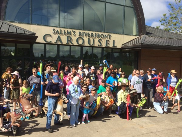 58 people (most on Pool Noodle ponies) rode into the Riverfront Carousel and sang Happy Birthday to the Carousel ponies (who were all wearing party hats for their 13th Birthday party). The Operations Manager was surprised and delighted and really, really wants a geocache there now! He said “it gave him goosebumps seeing us”.