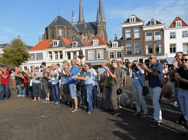 With pride we would like to report our WWFM XI event, “Applause for Hugo”. Hugo, in this case, is a statue of Hugo the Groot on the central square in Delfs. At 19:00 hours, a lot of people walked up to this statue and gave it a standing ovation.
