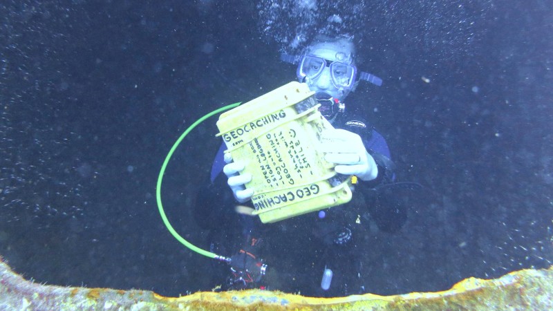 The CO is Hindl.com, who’s been a technical SCUBA instructor for a decade, regularly leads tourists on dives to the Kittiwake, and thought geocaching would make an extra special addition to an already exciting exploration for many people. But he’s been careful about his choice of underwater cache locations: “I would not allow myself to put any geocaches on the historical sites or pristine reefs, but I felt like it was ok at the artificial (man made) wrecks.” Which the Kittiwake is.