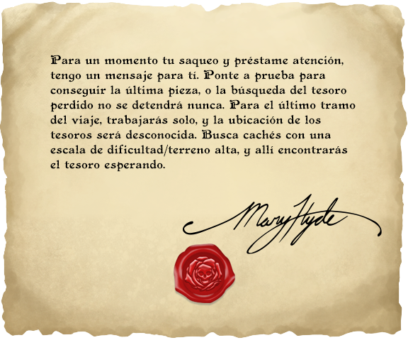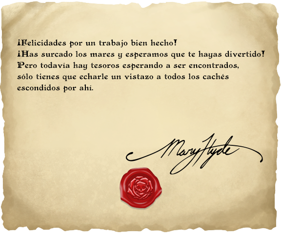 Ha sido una gran aventura navegar los océanos del geocaching, trabajando con tu tripulación y buscando el tesoro. ¡En realidad, más de 47.400 geocachers encontraron las cuatro piezas del mapa y consiguieron el souvenir del cofre del tesoro, encontrando el tesoro perdido de Mary Hyde!