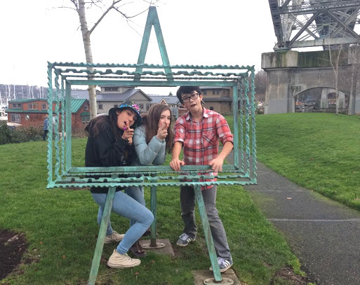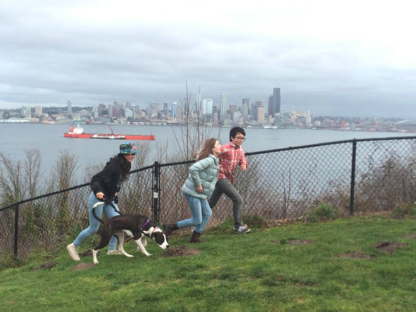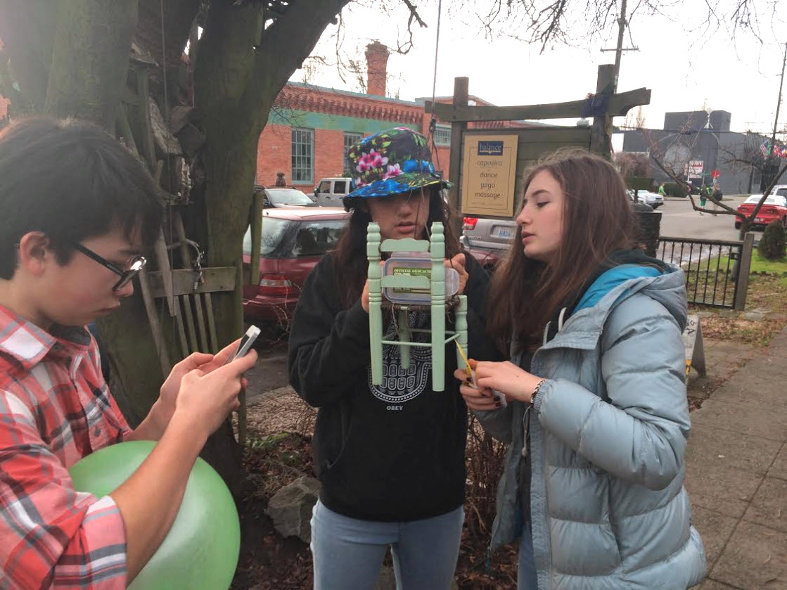 My daughter Maxine, her friends Rebecca and Oscar are all in 7th grade. A few weeks ago on a typical Seattle day – overcast, with intermittent drizzle and sun breaks – we went geocaching. We brought our trusty dog Clover along for the ride.