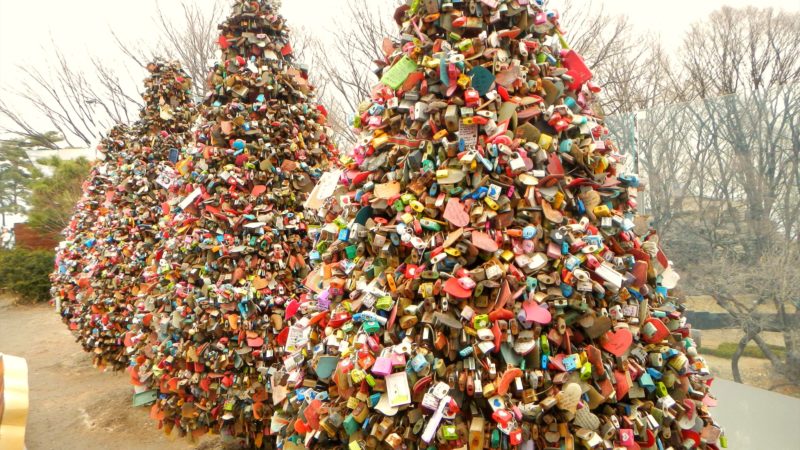 At the N Seoul Tower on Namsan Mountain in central Seoul, a less traditional type of love-locking is happening. Seven “trees” at the base of the tower are being festooned with thousands of colorful locks.