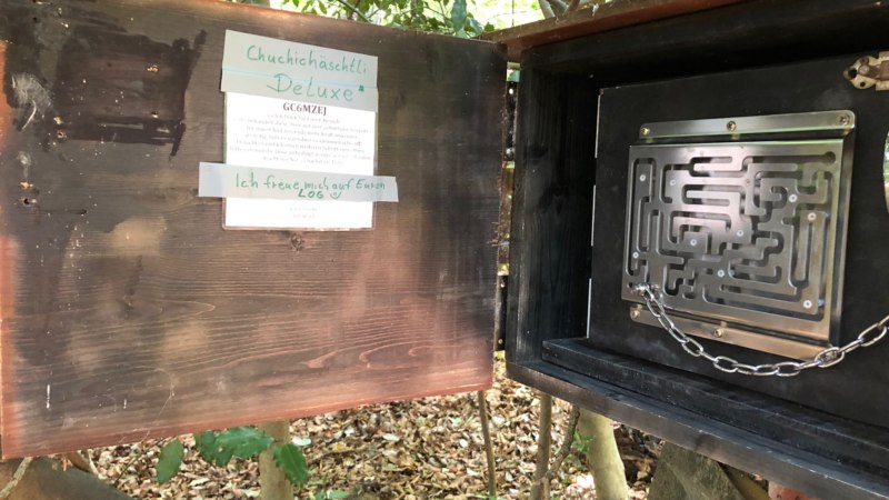 Welcome to Chuchichäschtli Deluxe! Did you pronounce that correctly? If not, don’t worry you’re not alone — trying to pronounce the name of this geocache is almost as puzzling as the cache itself. Swiss-German (Schweizerdeutsch) speakers can say this expression with ease, but we won’t keep the door shut on the translation. It is the typical Swiss-German term for kitchen cupboard, although this isn’t your typical cupboard (unless you like to store things in the woods). Opening the first door presents a big challenge, a labyrinth that is more deceptive than meets the eye.